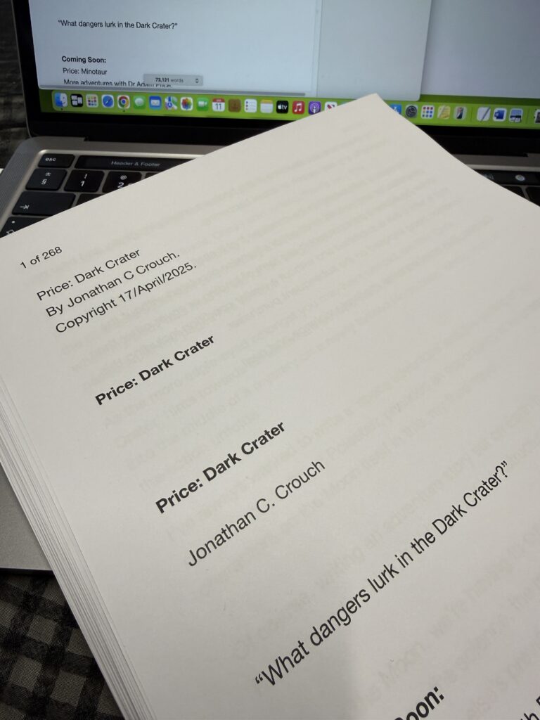 It’s started! Proof reading the first draft of my latest Dr Adam Price novel – Price: Dark Crater. .. and (I’ve just realised) a massive spoiler for the future… Did you spot it?