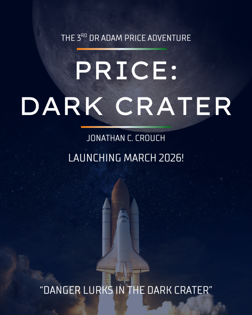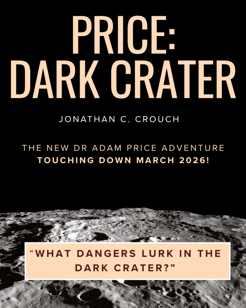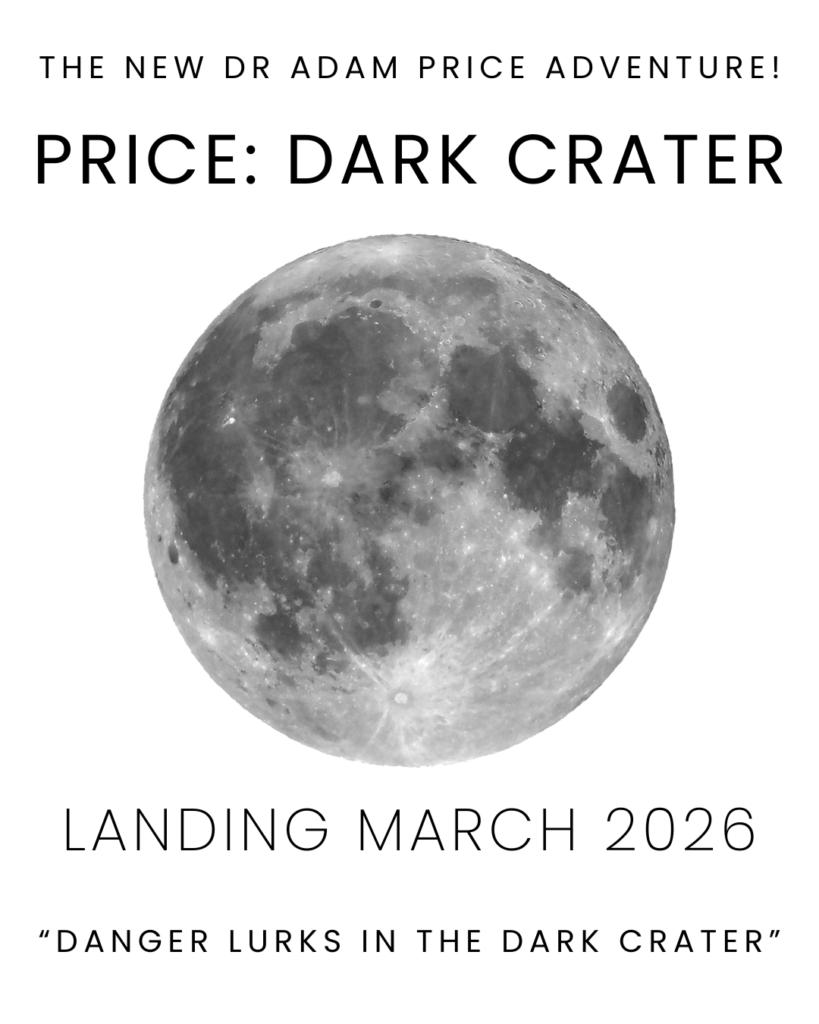 I’ve been working on some teaser poster ideas for the forthcoming launch of my 3rd Dr Adam Price Adventure novel, titled Price: Dark Crater.